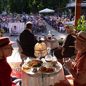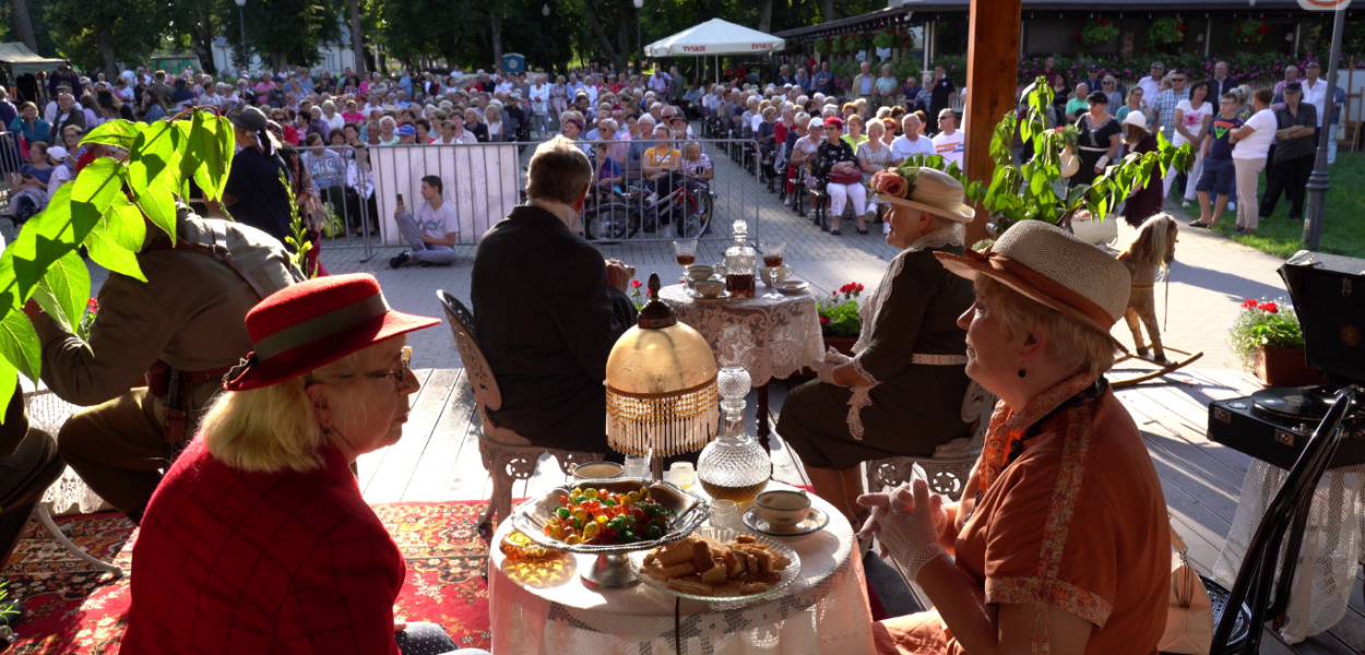 Plac wokół amfiteatru zajmowały kramy, na których lokalni sprzedawcy sprzed lat prezentowali swoje wyroby, a na samym środku sceny mogliśmy podziwiać odtworzoną z pietyzmem kawiarenkę. Zachwyt budziła nie tylko gra aktorów, ale również epokowe stroje czy oryginalne rekwizyty. Poznaliśmy przedstawicieli mniejszości żydowskiej, romskiej, zamożnych mieszkańców oraz tych nieco biedniejszych, mieszkańców wsi, którzy zaopatrywali się w mieście, ale przede wszystkim wzięliśmy udział w żywej lekcji historii i zasięgnęliśmy wiedzy o zwyczajach, kuchni i modzie osób żyjących 100 lat temu w Mławie. Inscenizacji towarzyszyła wystawa zdjęć, a w trakcie pokazu odbył się błyskawiczny konkurs z upominkami pt. "Co wiem o przedwojennej Mławie". Publiczność miała także okazję, by na stylizowanych straganach skosztować specjałów, którymi zajadali się nasi przodkowie.