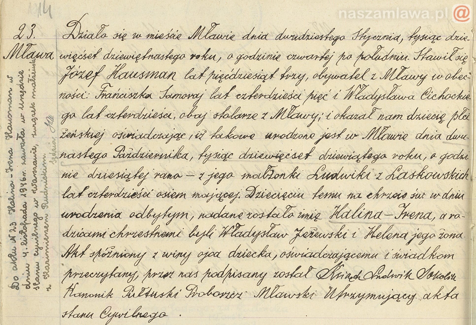 Prezentuje też zdjęcie autorki oraz jej akt urodzenia wydany w Mławie.