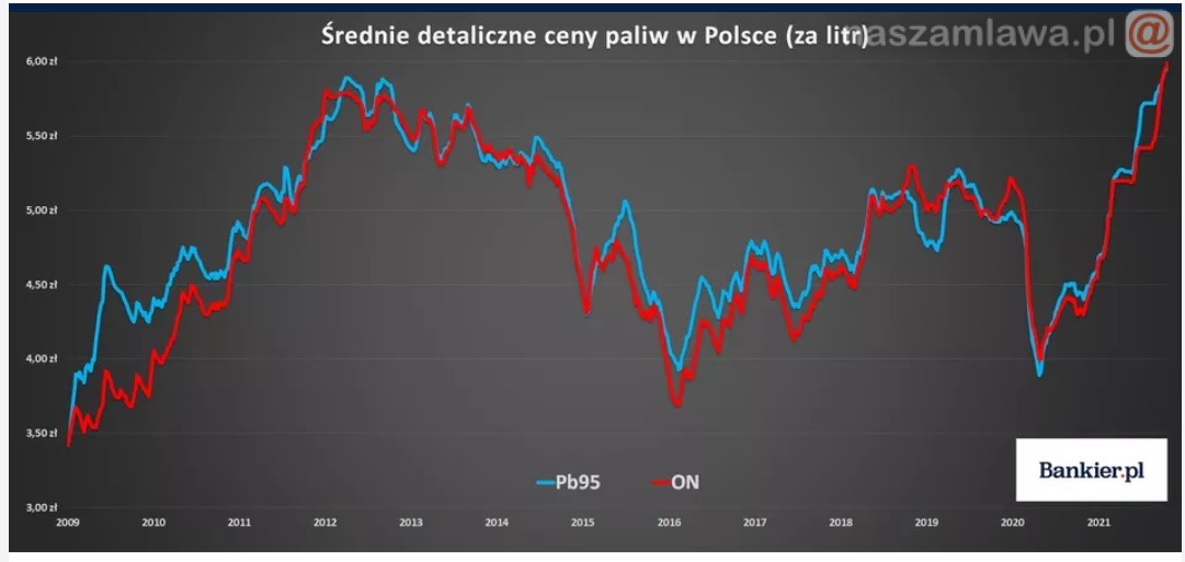 Ciekawostka. Warto się przyjrzeć jak skaczą ceny paliw na przestrzeni ostatnich lat w Polsce. Wykresy cen publikuje portal bankier.pl.