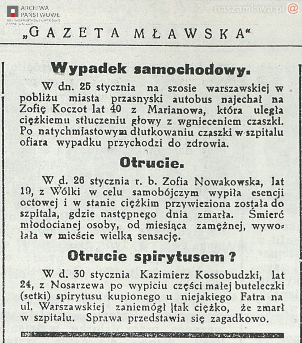 Archiwum Państwowego w Warszawie Oddział w Mławie. Przeczytamy tam imiona i nazwiska oraz wiek uczestników zdarzeń, jak do nich doszło, jakie podjęto leczenie i z jakim skutkiem. W numerze gazety opublikowano m.in. szczegółowe informacje o wypadku z 25 stycznia 1939 roku, kiedy to na szosie warszawskiej w pobliżu miasta przasnyski autobus najechał na mieszkankę Marianowa. Kobieta z wgnieceniem czaszki przeżyła i po dłutkowaniu czaszki w szpitalu miała dochodzić do zdrowia. Była też informacja o dwóch zatruciach, jedno alkoholem. Zobaczcie sami.