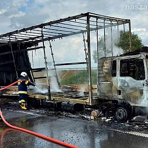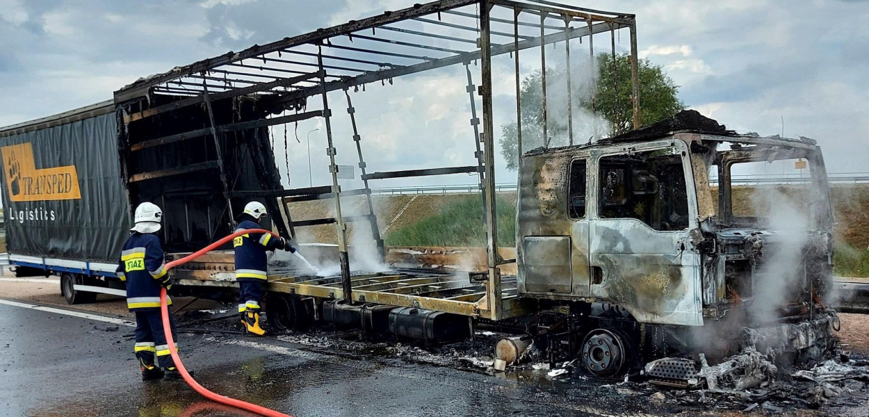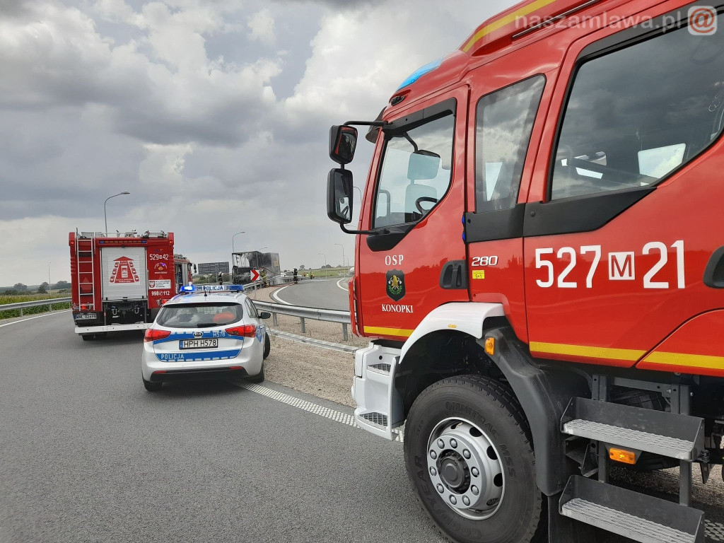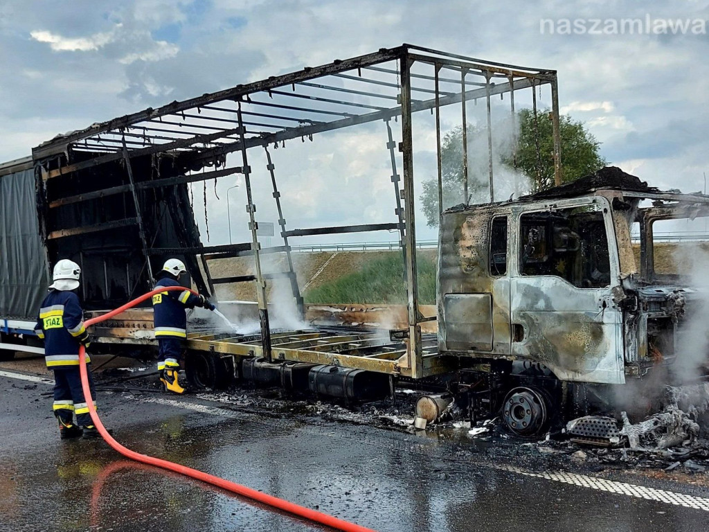 Służby gasiły pożar samochodu ciężarowego przy zjeździe z drogi ekspresowej nr 7 na wysokości miejscowości Dunaj w powiecie mławskim. Pojazd spłonął doszczętnie.