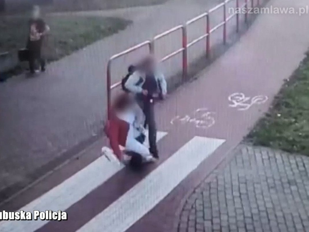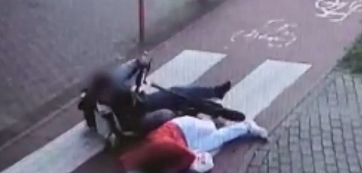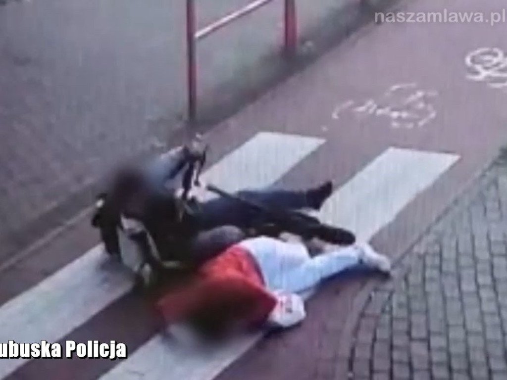 Film przedstawia nagranie z monitoringu miejskiego, na którym widać - jadącą drogą dla rowerów - osobę na hulajnodze, która wjeżdża w kobietę wchodzącą na przejście dla pieszych. Obie osoby upadają na drogę.