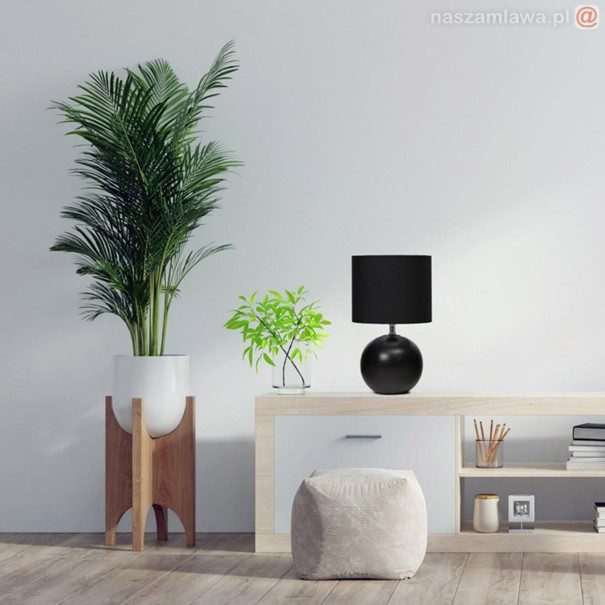 Czarna lampa stołowa jako stylowy kontrast dla jasnej, spokojnej aranżacji