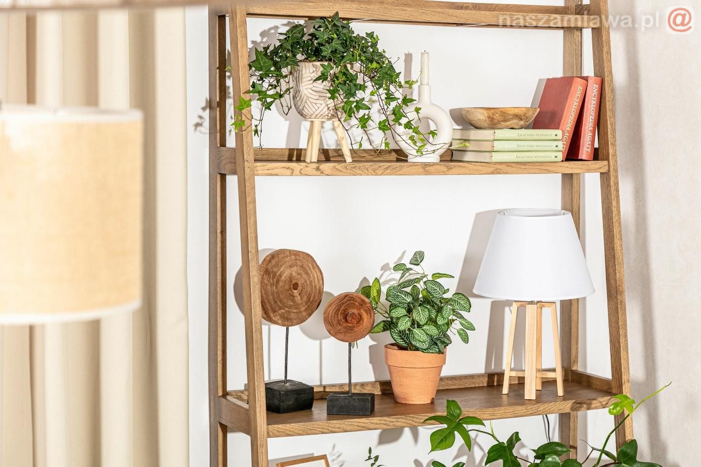 Lampa stołowa trójnóg ciekawie zaaranżowana na półce regału