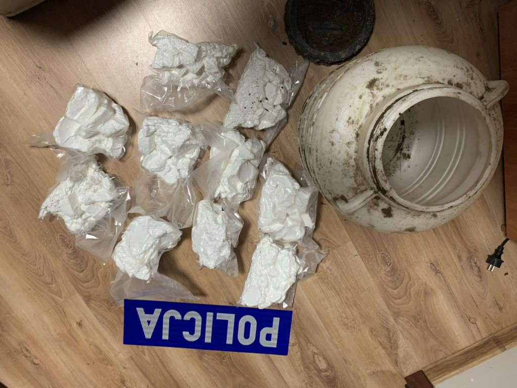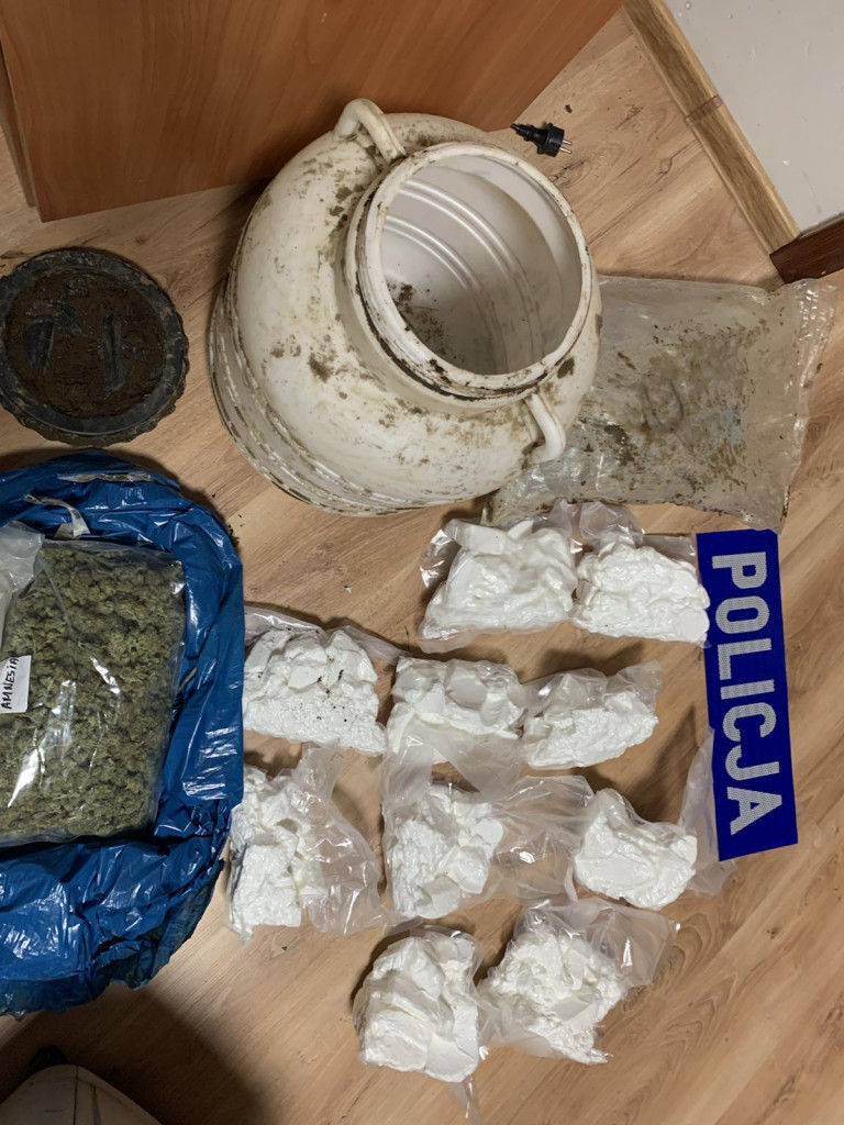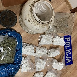 Trzech zatrzymanych to mieszkańcy Mławy (30-35 lat). Na trop ich działalności wpadli mławscy kryminalni, prowadząc ustalenia operacyjne.- W jednym z małych, sieciowych sklepów, prowadzonych przez 30-letniego mławianina, na zapleczu policjanci odnaleźli i zabezpieczyli ponad 160 porcji handlowych kokainy i amfetaminy. Jak ustalono, właścicielowi sklepu, nielegalny towar dostarczał 33-letni mieszkaniec Mławy. Narkotyki trzymał zakopane w beczce na prywatnej działce w pobliżu lasu. Jak wstępnie ustalono, współdziałał z nimi także 35-letni mławianin. Narkotyki zabezpieczone w hermetyczne, foliowe torby zakopał w okolicy swojej posesji. Cześć narkotyków odnaleziono z wykorzystaniem psa tropiącego. W wyniku prowadzonych przeszukań mławscy kryminalni zabezpieczyli ponad 10 kilogramów amfetaminy o wartości rynkowej, przekraczającej 300 tysięcy zł oraz marihuanę wartą blisko 90 tysięcy zł. Dalsze czynności śledczych doprowadziły do kuriera narkotykowego. Podejrzany, 59-letni mieszkaniec Iławy, został zatrzymany przez mławskich policjantów w pobliżu Grudziądza. W jego iławskim mieszkaniu policjanci odnaleźli 130 gramów marihuany - informuje asp. szt. Anna Pawłowska z KPP w Mławie.W wyniku czynności, realizowanych pod nadzorem prokuratora rejonowego, dwóch zatrzymanych mieszkańców Mławy (30 i 35 lat) usłyszało zarzut posiadania znacznej ilości narkotyków, natomiast dwóch pozostałych zarzut wprowadzania do obrotu znacznych ilości narkotyków. 33-letni mławianin oraz 59-letni mieszkaniec Iławy zostali aresztowani na 3 miesiące. Wszystkim zatrzymanym grozi wieloletnia kara pozbawienia wolności. Sprawa ma charakter rozwojowy.
