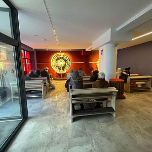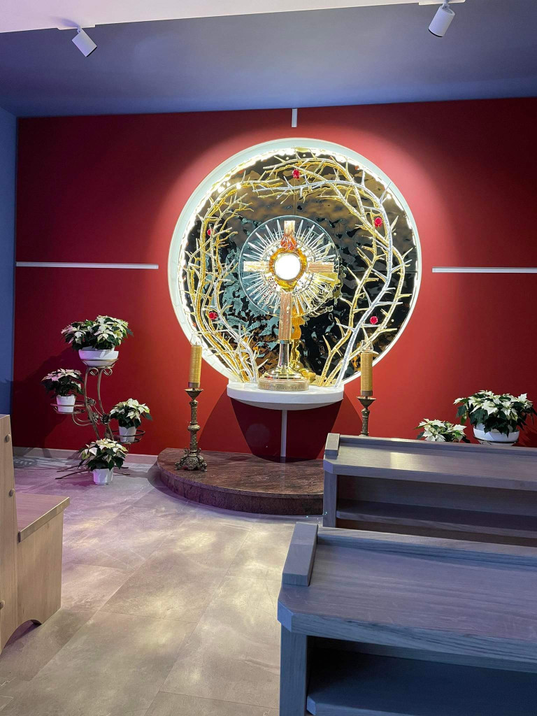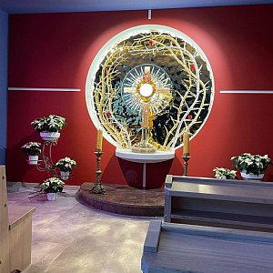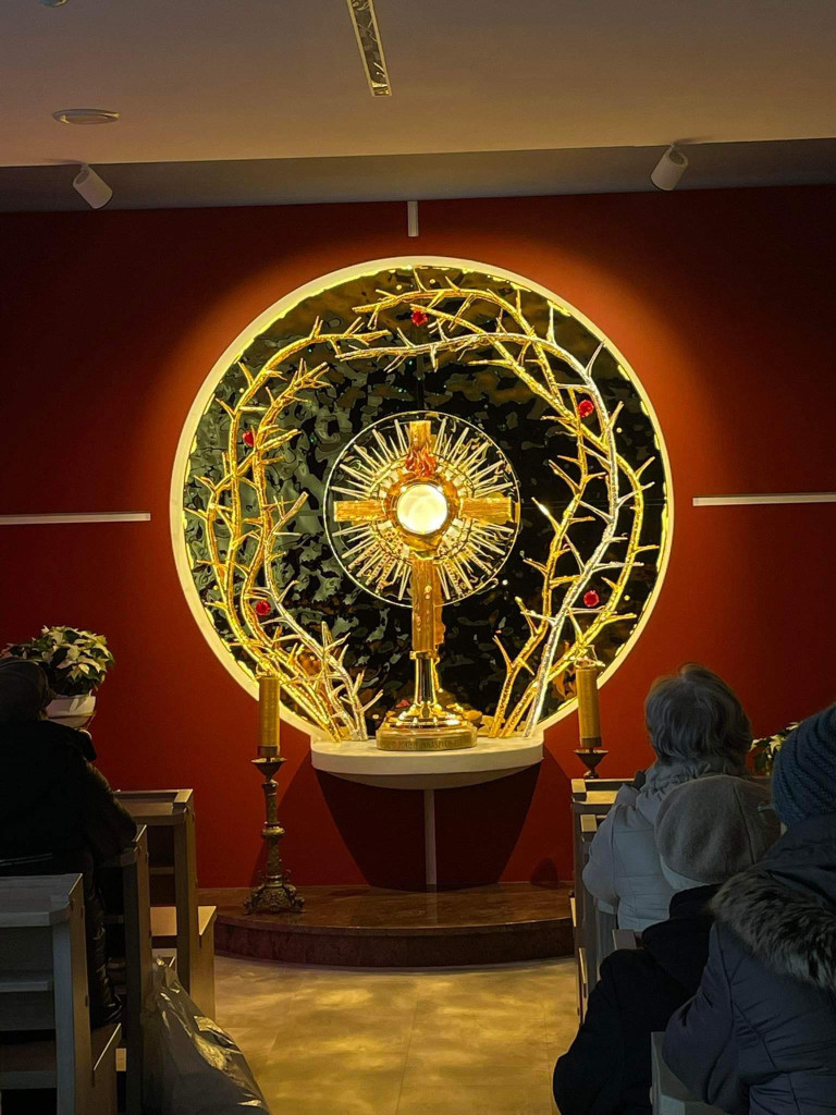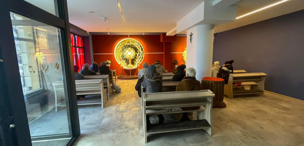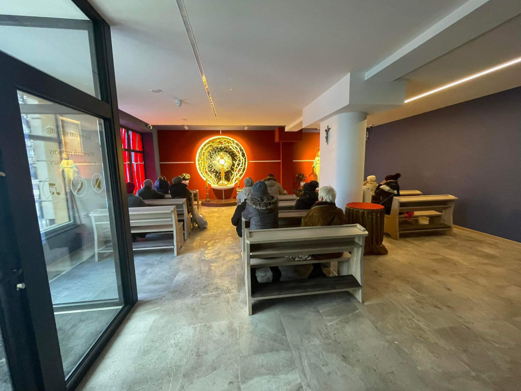 Kościół jest otwarty od rana do wieczora, ale w kaplicy jest przez 24 h wystawiony Najświętszy Sakrament, czyli ŻYWY BÓG. Każdy może przyjść i się z Nim spotkać. Na każdego Pan Jezus Eucharystyczny w tej kaplicy czeka. Przyjdź i pobądź z Nim, a zobaczysz jak wielką łaską jest takie spotkanie.