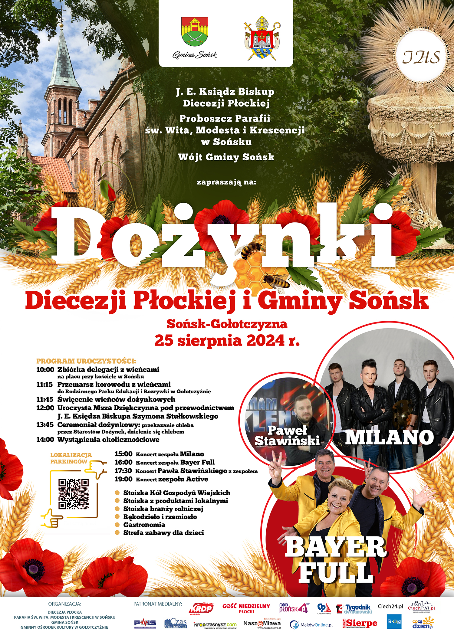 Dożynki są okazją do świętowania zakończenia żniw oraz podziękowania za plony. Zbliżają Dożynki Diecezji Płockiej, które zaplanowano w miejscowościach Sońsk i Gołotczyzna (w gminie Sońsk) 25 sierpnia 2024 r.Zapowiada się wydarzenie pełne atrakcji. Uczestników czekają uroczystości o charakterze religijnym i rozrywkowym.Świętowanie zaplanowano do godziny 10:00. Delegacje z wieńcami dożynkowymi zbiorą się przy kościele w Sońsku, ażeby wyruszyć w barwnym korowodzie do Rodzinnego Parku Edukacji i Rozrywki w Gołotczyźnie. Tam o godzinie 11:45 odbędzie się święcenie wieńców.Uroczysta msza święta dziękczynna rozpocznie się o godzinie 12:00 pod przewodnictwem J.E. Księdza Biskupa Szymona Stułkowskiego.Około godziny 13:45 zaplanowano ceremoniał dożynkowy, z przekazaniem przez starostów dożynek dziękczynnego chleba.Jak na taką uroczystość przystało, nie zabraknie okolicznościowych przemówień około godziny 14 oraz części rozrywkowej.Od godziny 15:00 na scenie w Gołotczyźnie wystąpią: Milano (godz. 15:00), Bayer Full (o godzinie 16:00), zespół Active (o godzinie 19:00), Paweł Stawiński (o godzinie 17:30).Nie zabraknie też barwnych straganów, stoisk ze swojskim jadłem i napojami, związanych z branżą rolniczą, rękodziełem i rzemiosłem.Organizatorami dożynek są Diecezja Płocka, Parafia Św. Wita, Modesta i Krescencji w Sońsku oraz Gminny Ośrodek Kultury w Gołotczyźnie.Zapraszamy w imieniu organizatorów. Szczegóły na plakacie.