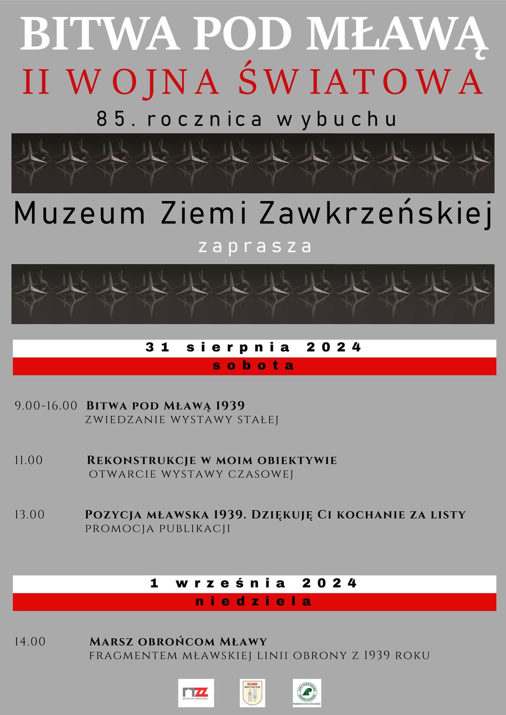 Przed nami 85. rocznica bitwy pod Mławą. Mławskie muzeum zaprasza na wydarzenia, wpisujące się w miejskie uroczystości, jak: marsz śladem fortyfikacji polowych z 1939 r., promocje publikacji i wystawy. Muzeum Ziemi Zawkrzeńskiej w Mławie zaprasza na wydarzenia, wpisujące się w miejskie uroczystości związane z wybuchem drugiej wojny światowej i bitwą pod Mławą.W ramach obchodów w sobotę, 31 sierpnia 2024 r. od godz. 9.00 do 16.00 można bezpłatnie zwiedzać wystawę stałą "Bitwa po Mławą". O godz. 11.00 zaplanowano otwarcie wystawy fotografii "Rekonstrukcja w moim obiektywie". Natomiast o godz. 13.00 będzie miała miejsce promocja publikacji "Pozycja mławska 1939. Dziękuję Ci kochanie za listy".Na marsz śladem fortyfikacji polowych z 1939 r. organizatorzy - Stowarzyszenie Mława - miasto zabytkowe, Muzeum Ziemi Zawkrzeńskiej w Mławie oraz Nadleśnictwo Dwukoły - zapraszają w niedzielę, 1 września 2024 r. Marsz odbędzie się około godz. 14. - po oficjalnych uroczystościach w mauzoleum w Uniszkach Zawadzkich. Stamtąd uczestnicy wyruszą w 3-kilometrową trasę do zagrody żubrów w Krajewie.