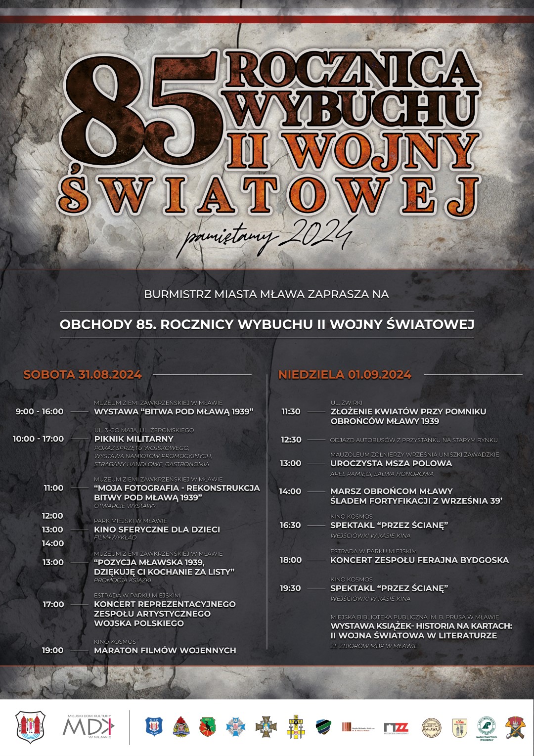 Z okazji 85. rocznicy wybuchu II wojny światowej i Bitwy pod Mławą mławskie władze i jednostki kultury przygotowały uroczystości i wydarzenia poświęcone wspomnianej tematyce.Wielką atrakcją w Mławie na pewno będzie Piknik Militarny organizowany w sobotę 31 sierpnia w godz. 10.00-17.00. Pokaz współczesnego sprzętu wojskowego zaplanowano na ulicach 3 Maja i Stefana Żeromskiego.Będziemy mogli obejrzeć m.in. wyrzutnię rakietową Langusta, radiolokacyjny zestaw rozpoznania artyleryjskiego LIWIEC, opancerzony pojazd typu MRAP, system rakietowy Homar-K oraz wiele wozów wojskowych.Uczestnicy wydarzenia na terenie parku miejskiego będą mogli skosztować ciepłej grochówki oraz odwiedzić stoiska jednostek wojskowych. W sobotę Mława będzie gościć żołnierzy z 20. Bartoszyckiej Brygady Zmechanizowanej im. Hetmana Polnego Litewskiego Wincentego Gosiewskiego, 1. Mazurskiej Brygady Artylerii im. gen. J. Bema w Węgorzewie, 2. Ośrodka Radioelektronicznego w Przasnyszu, 5. Mazowieckiej Brygady Obrony Terytorialnej i Wojskowego Centrum Rekrutacji w Ciechanowie.Kolejną atrakcją - o godz. 12.00, 13.00 i 14.00 - będzie Kino Sferyczne na terenie parku miejskiego. Seanse zaplanowano w specjalnym namiocie, w którym będzie wyświetlany film o tematyce historycznej poprzedzony krótkim wykładem. Wiek uczestnika: od 13. roku życia. Liczba miejsc na jednym seansie: 25. Czas trwania jednego seansu: ok. 40 minut. Jak informują organizatorzy, film dokumentalny o II wojnie światowej będzie wyświetlany w jakości 4K na ekranie 360 stopni. Wstęp bezpłatny.Także w sobotę na scenie w parku o godz. 17:00 zaplanowano koncert Reprezentacyjnego Zespołu Artystycznego Wojska Polskiego. Artyści wystąpią w składzie: mała orkiestra symfoniczna, soliści, chór i balet.To nie koniec atrakcji. W kinie Kosmos w Mławie o godz. 19.00 i 21.00 zostaną wyświetlone dwa filmy o tematyce wojennej - "Filip" i "Orlęta. Grodno `39".Uroczystości w Uniszkach i spektakl w MławieW niedzielę 1 września nie może zabraknąć oficjalnych uroczystości przy pomniku Obrońców Mławy 1939 przy ul. Żwirki i w Uniszkach Zawadzkich przy Mauzoleum Żołnierzy Września.Natomiast w kinie Kosmos w Mławie o godz. 16:30 i 19:30 zostanie zaprezentowany również spektakl "Przez ścianę" w reżyserii Leszka Zdunia. Wstęp bezpłatny na bilety dostępne w kasie kina Kosmos.Tak się złożyło, że w niedzielę 1 września zaplanowano ostatni koncert z cyklu "Z kulturą za pan brat". Na estradzie w parku miejskim wystąpi Ferajna Bydgoska - kapela podwórkowa, muzycznie nawiązująca do czasów przedwojnia i ulicznych występów. Zespół prezentuje prawdziwy uliczny folklor. Występ 1 września w Mławie będzie koncertem patriotyczno-miejskim z pieśniami patriotycznymi w pierwszej części oraz w drugiej części z przedwojennymi szlagierami, ulicznymi balladami i największymi hitami dwudziestolecia międzywojennego.