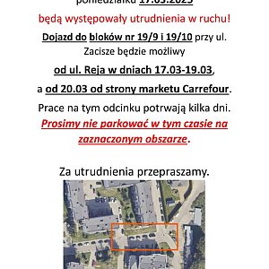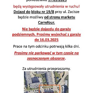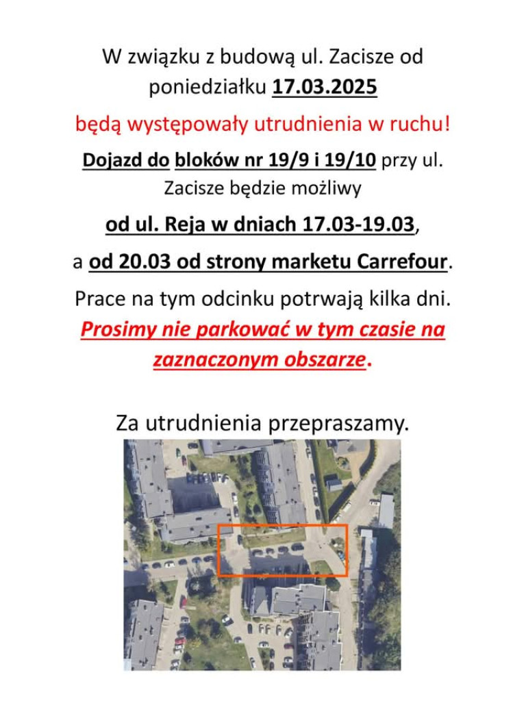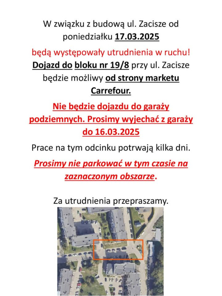 PILNE. Znaczące utrudnienia na mławskim osiedlu. Mieszkańcy Osiedla Zacisze w centrum Mławy muszą się liczyć ze sporymi utrudnieniami, co najmniej od 16 marca 2025 roku. Ma to potrwać kilka dni.Mławski ratusz informuje o znaczących utrudnieniach w ruchu kołowym na Osiedlu Zacisze w Mławie. To w związku z budową.Nie będzie dojazdu do garaży podziemnych. Informujący o utrudnieniach proszą o nie parkowanie w garażach podziemnych i wyjazd z nich do 16 marca 2025 roku.Lepiej też nie parkować na wyznaczonym na zdjęciu obszarze.Osiedle Zacisze będzie poważnie zablokowane dla ruchu kołowego i ma to potrwać kilka dni.Szczegóły znajdziecie na udostępnionych przez mławski ratusz zdjęciach, które publikujemy poniżej.