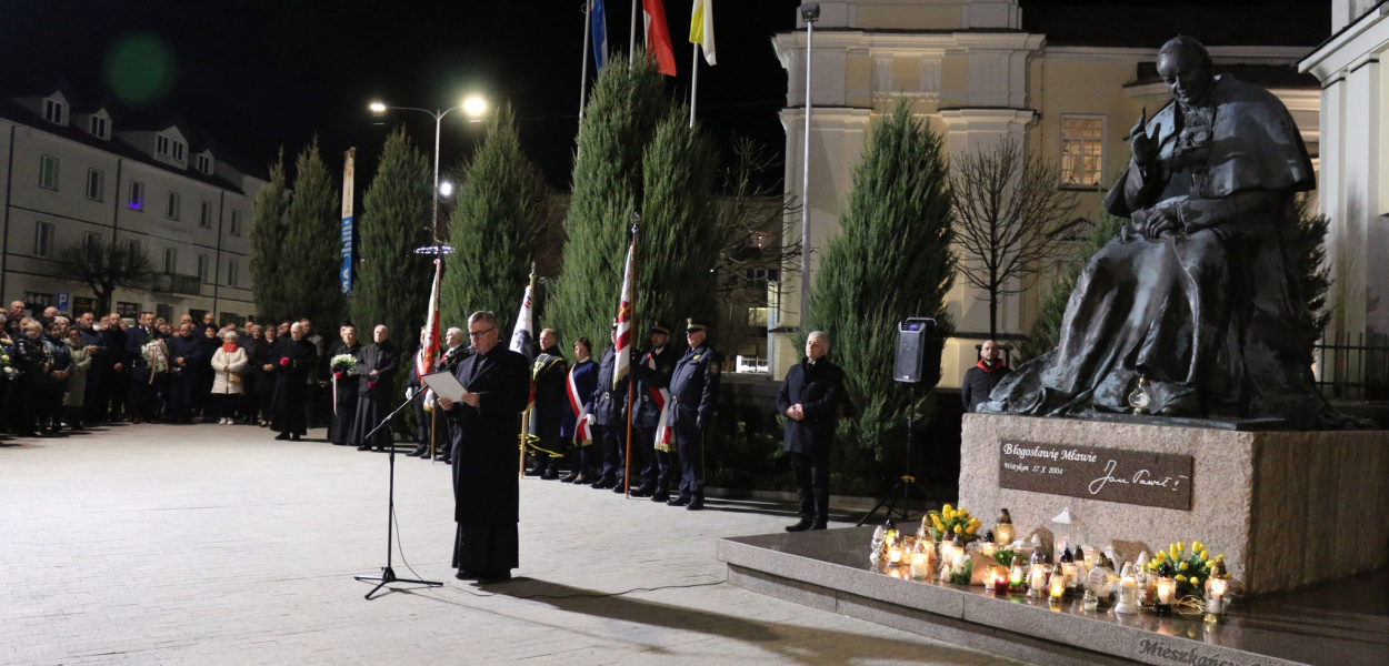 Następnie podczas uroczystości na Starym Rynku nie zabrakło modlitwy, wystąpienia Prezesa Stowarzyszenia "Pontyfikat Papieża Jana Pawła II" w Mławie, Andrzeja Lampkowskiego, przedstawiającego historię działań związanych z papieżem w mieście, przemówień oraz kwiatów u stóp pomnika papieża. Na koniec wykonano Barkę, ulubioną pieśni św. Jana Pawła II.