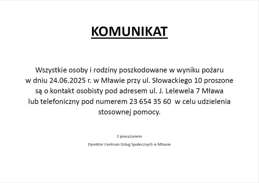 "W związku z trwającym pożarem budynku mieszkalnego przy ul. Słowackiego w Mławie, Burmistrz Miasta Mława Piotr Jankowski podjął niezbędne działania mające na celu zapewnienie pomocy wszystkim poszkodowanym mieszkańcom. Został zwołany Miejski Zespół Zarządzania Kryzysowego, który prowadzi prace mające na celu udzielenie natychmiastowego wsparcia osobom dotkniętym zdarzeniem. Miasto Mława zapewnia, że nikt nie zostanie bez pomocy. Dla mieszkańców, którzy nie będą mieli gdzie się zakwaterować , przygotowywane są tymczasowe miejsca w Zespole Ośrodków Wsparcia oraz w Hotelu Mława. W hotelu trwa już przygotowanie 100 porcji posiłków. Na miejscu nieprzerwanie pracują służby ratunkowe: straż pożarna, policja oraz pogotowie.Sytuacja jest na bieżąco monitorowana przez władze miasta.Miasto Mława pozostaje w gotowości do podejmowania dalszych działań, w zależności od rozwoju wydarzeń. O kolejnych krokach i możliwościach wsparcia będziemy informować w następnych komunikatach." - informuje mławski ratusz.