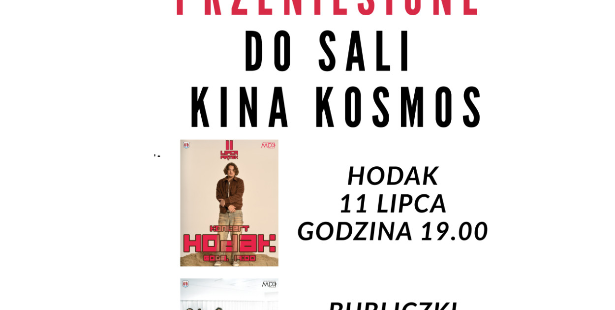 Ważna zmiana lokalizacji koncertów podczas Dni Mławy 2025. Hodak i Bubliczki zagrają w kinie Kosmos! Chodzi o koncerty zaplanowane pierwotnie w plenerze w piątek 11 lipca i w niedzielę 13 lipca.