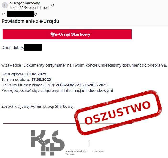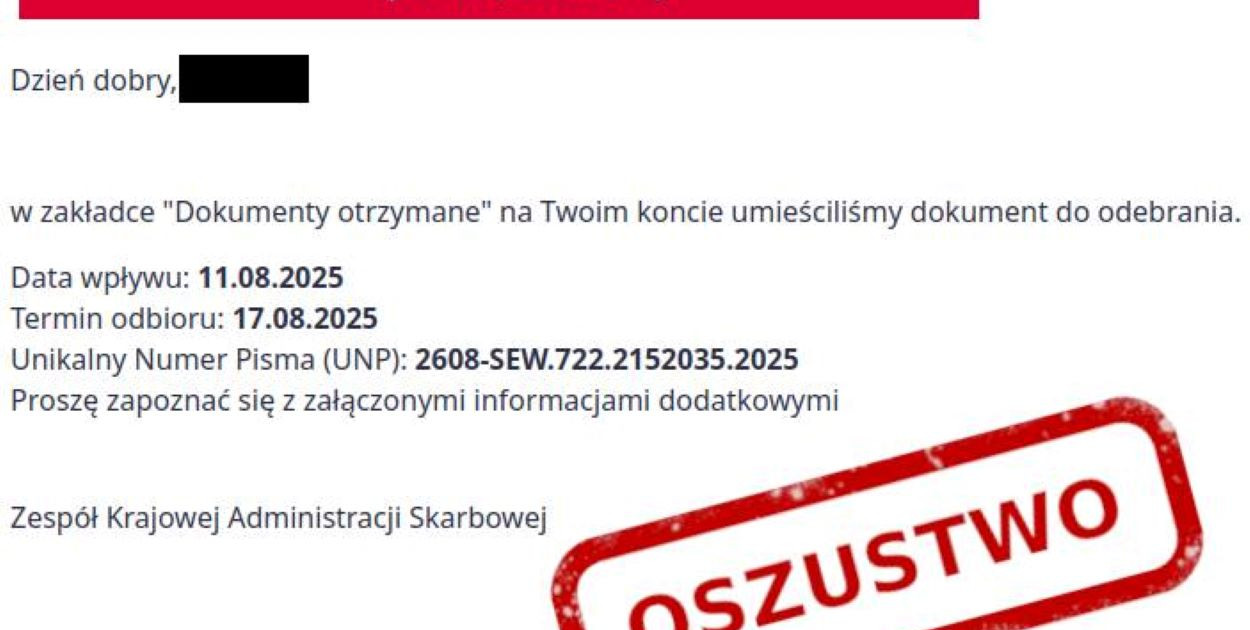 Oszuści podszywają się pod urząd skarbowy, wysyłając e-maile z informacją o rzekomym dokumencie do odebrania w zakładce „Dokumenty otrzymane”.