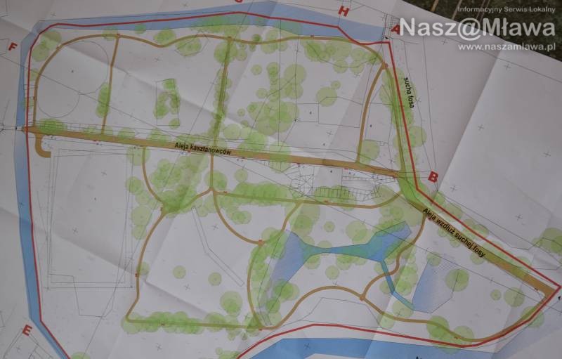 Z uzyskanej dotacji zostaną odtworzone aleje, według dawnego układu. Jak widać na powyższym szkicu, będzie szeroka, 5-metrowa aleja kasztanowa prowadząca do zamku, która będzie się rozgałęziać w dwie strony, wzdłuż fosy. Od niej na całej długości będą odchodzić węższe, 2-metrowe ścieżki. Wszystkie mają być żwirowe.