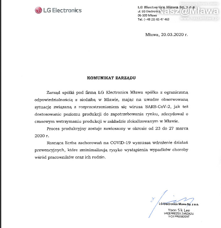 - W załączeniu przesyłam komunikat zarządu Spółki odnoszący się do wstrzymania produkcji w najbliższym tygodniu. W zakresie zatrudnienia Spółka nie planuje żadnych zmian - informuje portal Nasza Mława Krystian Karcz, Administration Department Leader, LGEMA Administration Department.