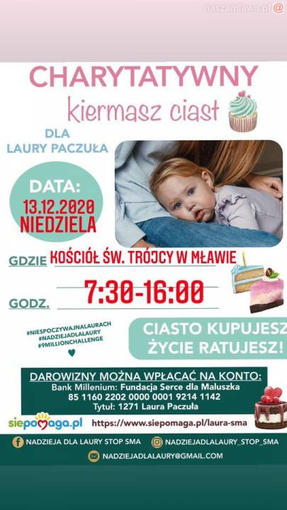 Jutro (13 grudnia) przed kościołem Świętej Trójcy odbędzie się świąteczny kiermasz ciast, z którego dochód zostanie przeznaczony na terapię genową dla maleńkiej Laury Paczuły. Dziewczynka choruje na SMA. Potrzebuje aż 9 milionów złotych, by żyć. Rodzina zbiera na terapię genową. Jedną z firm pomocy organizowanych przez wolontariuszy są kiermasze pysznych, domowych ciast. Organizatorzy serdecznie zapraszają mławian na wydarzenie, które będzie miało miejsce pod Kościołem Świętej Trójcy w Mławie od godziny 7:30 do 16.