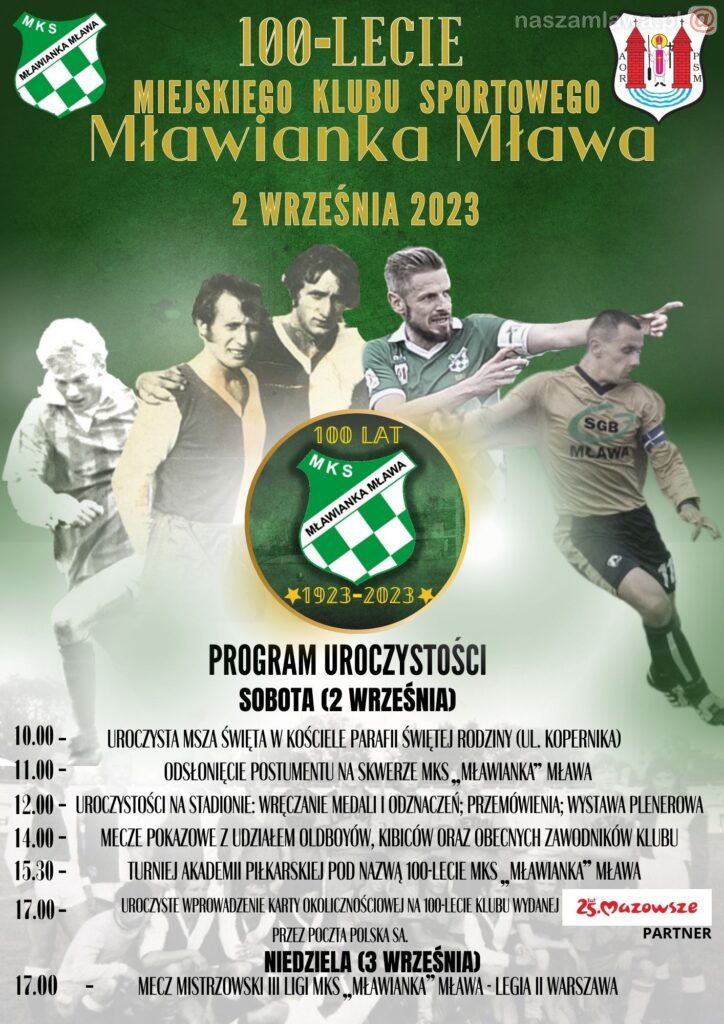 Uroczystości stulecia klubu sportowego Mławianka Mława odbędą się dziś w sobotę 2 września.Rozpoczną się uroczystą mszą świętą w parafii Świętej Rodziny przy ul Kopernika o godzinie 10:00. Następnie o godzinie 11:00 będzie odsłonięty postument na skwerze MKS Mławianka Mława. W południe na stadionie miejskim zostaną wręczone medale i odznaczenia. Planowane są oficjalne przemówienia oraz wystawa plenerowa. Na godzinę 14:00 zaplanowano mecze pokazowe z udziałem oldbojów kibiców oraz obecnych zawodników klubu. Godzinę później rozpocznie się turniej akademii piłkarskiej pod nazwą 100-lecie MKS Mławianka Mława. Uroczyste wprowadzenie karty okolicznościowej na stulecie klubu wydanej przez pocztę polską które ma odbyć się o godzinie 17:00 ma zakończyć obchody.Dzień później w niedzielę o 17:00 rozegrany zostanie mecz mistrzowski 3 ligi MKS mławianka Mława Legia 2 Warszawa