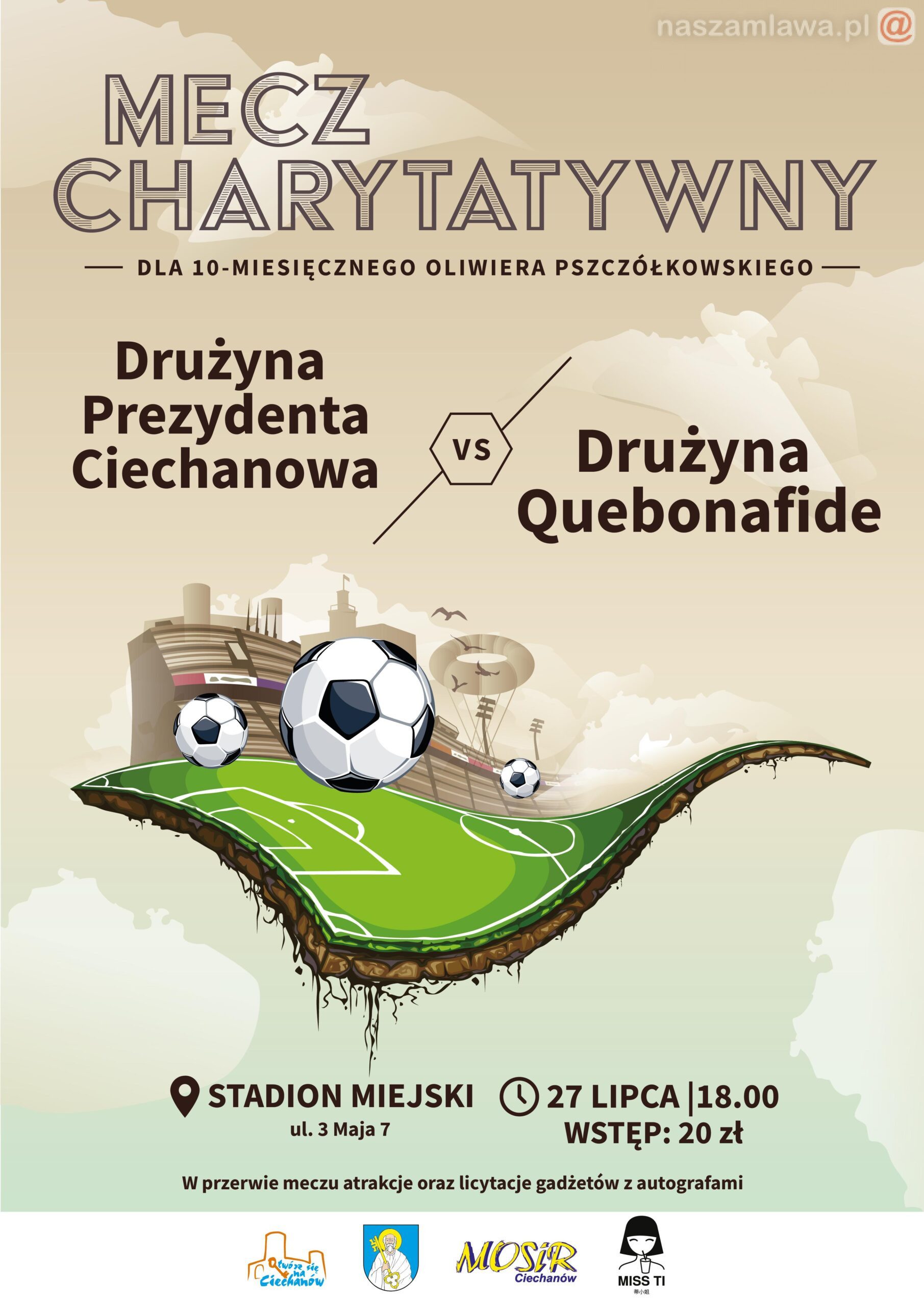 W najbliższą środę (27 lipca) o godz. 18.00 na stadionie przy ul. 3 Maja odbędzie się charytatywny mecz piłkarski. Na murawie drużyna prezydenta miasta zmierzy się z drużyną rapera Quebonafide.- W tym meczu wszyscy zagramy dla 10-miesięcznego dziecka, które walczy o zdrowie. Zostało bardzo niewiele dni na zebranie pieniędzy, aby przeprowadzić operację ostatniej szansy dla Oliwiera. Licznik zbiórki nabiera tempa, ale wciąż brakuje dużych pieniędzy - powiedział prezydent Krzysztof Kosiński.Rodzice Oliwierka Pszczółkowskiego mają czas tylko do końca lipca, by zebrać środki na skomplikowaną operację w Bostonie. To jedyny szpital, który chce podjąć się leczenia chłopca chorującego na PVS - zwężenie żył płucnych.Cały dochód ze sprzedaży biletów na charytatywny mecz w Ciechanowie zostanie przekazany na operację dziecka.- Kuba Grabowski przyłączając się do tej inicjatywy i organizując swoją drużynę po raz kolejny pokazał wielką wrażliwość na potrzeby dzieci oraz wsparcie dla swojego rodzinnego miasta. Zachęcam wszystkich do pomagania, liczymy na ciepłe przyjęcie przez kibiców na stadionie - dodał prezydent Ciechanowa.Bilet na mecz to koszt 20 zł i będzie sprzedawany przy wejściu na stadion. W trakcie przerwy odbędzie się licytacja cennych przedmiotów przekazanych przez miasto, raperów i innych darczyńców. Osoby prywatne i przedsiębiorcy zainteresowani wsparciem akcji mogą kontaktować się w tej sprawie z Urzędem Miasta Ciechanów (tel. 23 671 93 02, 23 671 93 04).Graczy na boisko stadionu wprowadzą młodzi piłkarze trenujący w ciechanowskich klubach sportowych: MKS, APN Olimp. Do organizacji przyłączą się też dziewczyny - tancerki i akrobatki z działających w mieście klubów tanecznych.Zbiórka na leczenie Oliwiera Pszczółkowskiego jest zarejestrowana i prowadzona przez Fundację Siepomaga. Osoby, które już teraz chcą pomóc rodzicom dziecka mogą wpłacać środki poprzez stronę internetową https://www.siepomaga.pl/oliwier.