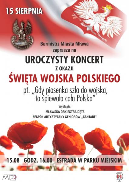 O godz. 10.00 w kościele Świętej Trójcy odprawiona zostania msza święta w intencji ojczyzny i jej bohaterów poległych na polu chwały, a następnie uroczysty przemarsz ulicami miasta na cmentarz parafialny.Część artystyczna rozpocznie się o godz. 16.00. Na estradzie w parku miejskim wytąpi Mławska Orkiestra Dęta oraz Zespół Artystyczny Seniorów "Cantare". Artyści wykonają najpiękniejsze pieśni śpiewane na cześć polskiego oręża, takie jak: "Wrócą chłopcy z wojny", "Gdzie są chłopcy z tamtych lat" czy "Czerwone maki na Monte Casino".