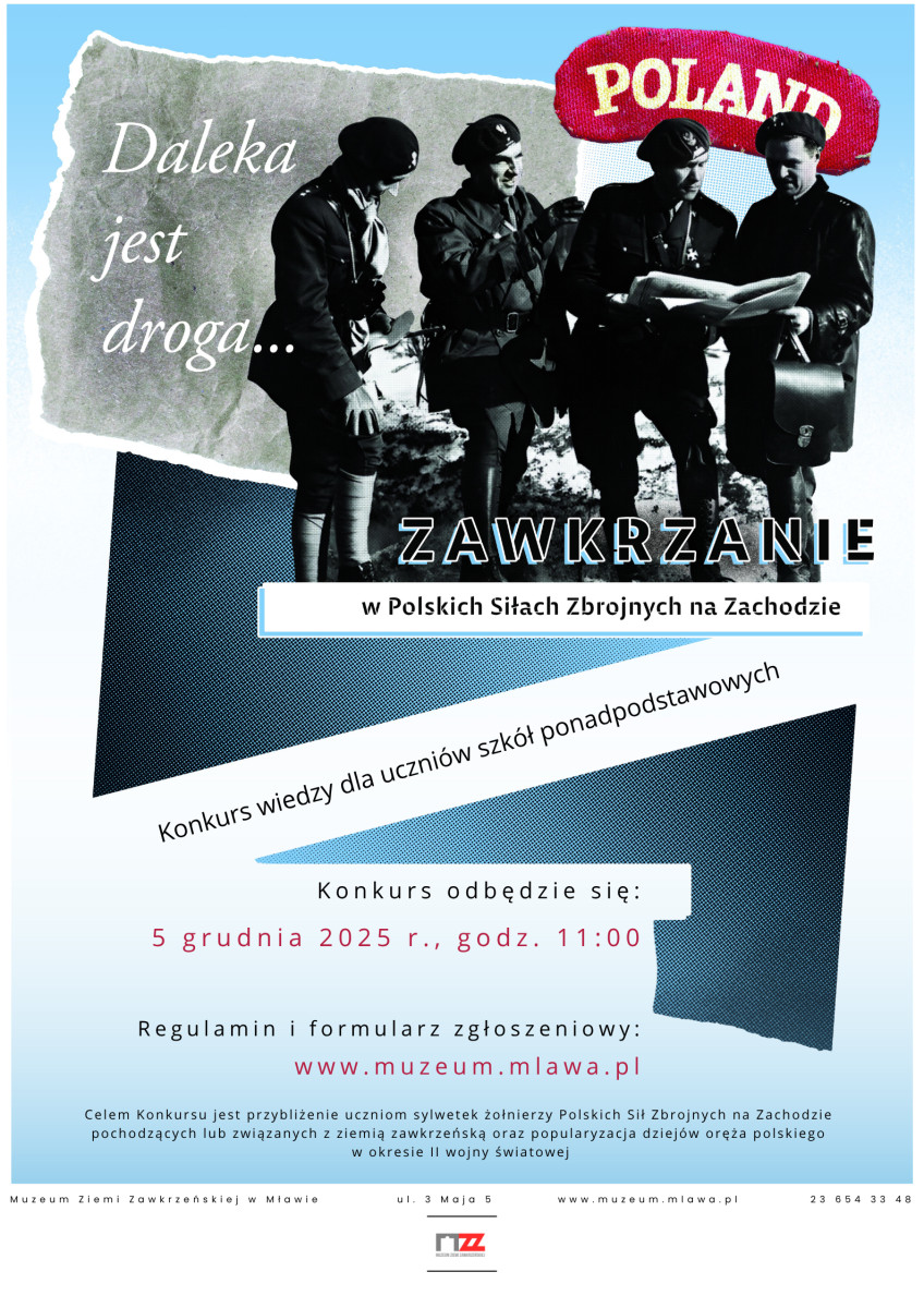 Muzeum Ziemi Zawkrzeńskiej w Mławie zaprasza uczniów szkół ponadpodstawowych z powiatu mławskiego do udziału w konkursie wiedzy historycznej pt. „Zawkrzanie w Polskich Siłach Zbrojnych na Zachodzie”.