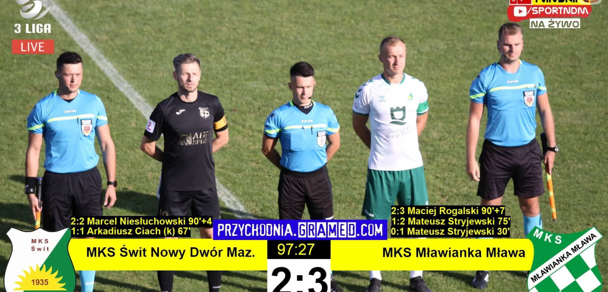 Bramki: Arkadiusz Ciach (67. - z rzutu karnego) i Marcel Niesłuchowski (90.) dla Świtu; Mateusz Stryjewski (30. i 75.) i Maciej Rogalski (90.) dla Mławianki
