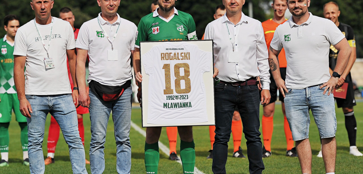 Popularny "Rogal" trafił na treningi naszego klubu w 1992 roku. Siedem lat później zaliczył debiut w seniorach. Wszystko się wtedy zaczęło - awans do pierwszej ligi z naszą ekipą, a potem lata w gry w KSZO Ostrowiec Świętokrzyski, Lechii Gdańsk, Podbeskidziu Bielsko-Biała, Olimpii Grudziądz, Chojniczance Chojnice oraz MKS-ie Ciechanów. Do Mławianki wrócił w 2017 roku. Najpierw zaliczył spadek do okręgówki, a potem dwa kolejne awanse, do czwartej i trzeciej ligi.Po raz ostatni zielono-białą koszulkę założył w sobotnie popołudnie. Wokół siebie miał aż ośmiu młodzieżowców (na ławce zasiedli min. bracia Michał i Mateusz Stryjewscy), Został zmieniony w 43. minucie - opaskę kapitańską przekazał Maciejowi Komorowskiemu.Koliński broni, napatnicy strzelająMimo zmienionego składu Mławianka nawiązała równorzędną walkę z walczącą o awans do drugiej ligi Pogonią Grodzisk Mazowiecki. Fantastycznie między słupkami spisywał się Mateusz Koliński. Wybronił kilka groźnych sytuacji. Dodatkowo sprzyjało mu szczęście. Piłka zatrzymała się dwukrotnie na poprzeczce po uderzeniach rywali.Ostatecznie skapitulował dwa razy - Pogoni wystarczyło to zaledwie do remisu. Mławianka wychodziła bowiem dwukrotnie na prowadzenie. W 16. minucie po podaniu od Rogalskiego, Mateusz Karol popędził na bramkę gości. "Wziął na plecy" defensora, po czym uderzył nie do obrony.Natomiast w drugiej odsłonie Karol wcielił się w rolę asystenta. Zagrał przytomnie do Joao Odillona, a ten okręcił się wokół własnej osi i uderzył mocno nie do obrony.Napastnik z Afryki mógł w doliczonym czasie zapewnić Mławiance zwycięstwo. Ostatecznie indywidualna szarża zakończyła uderzeniem zablokowanym przez obrońcę.Mateusz królemMimo nieobecności na murawie Mateusz Stryjewski mógł się cieszyć z prestiżowego indywidualnego osiągnięcia. Sięgnął po koronę króla strzelców. Strzelił aż dwadzieścia goli. Trzeci w zestawianiu snajperów był Michał Stryjewski, czwarty Odillon.Mławianka Mława - Pogoń Grodzisk Mazowiecki 2:2 (1:1)