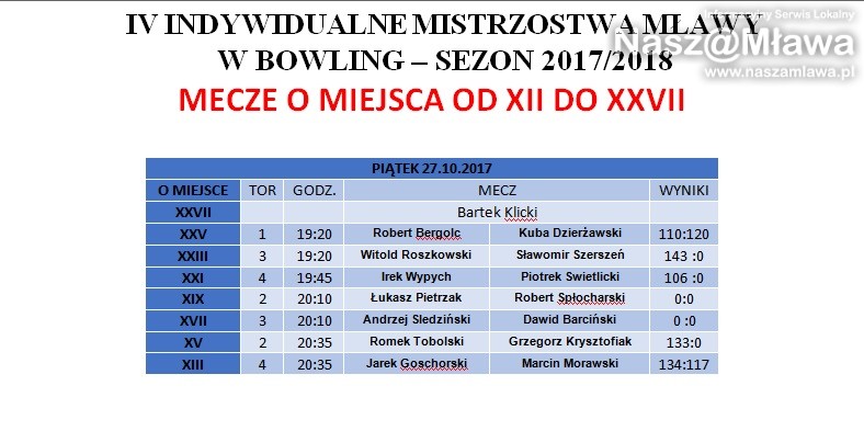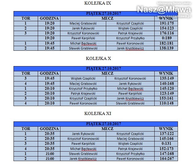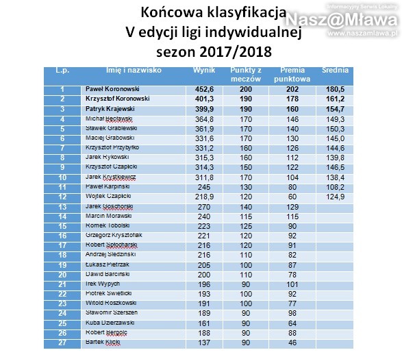 W piątek 27 października w kręgielni Planeta w Mławie odbył się finał Ligi Indywidualnej w bowling. Rozgrywki były pełne emocji. Pięciotygodniowa rywalizacja rozstrzygnęła się podczas trzech ostatnich kolejek.O miano najlepszego gracza rywalizowało 27 osób. Niekwestionowanym mistrzem został Paweł Koronowski, który nie tylko obronił tytuł sprzed roku, ale przewagą ponad 50 punktów nie pozostawił rywalom szans i złudzeń, kto zasłużył na najwyższe podium. Drugie miejsce przypadło Krzysztofowi Koronowskiemu, który dzięki swojej świetnej grze w ostatnim dniu zdołał wyprzedzić Patryka Krajewskiego. Rywalizacja między tymi zawodnikami rozstrzygała się do ostatnich rzutów, czego dowodem jest minimalna jedynie różnica 1,4 punktu.