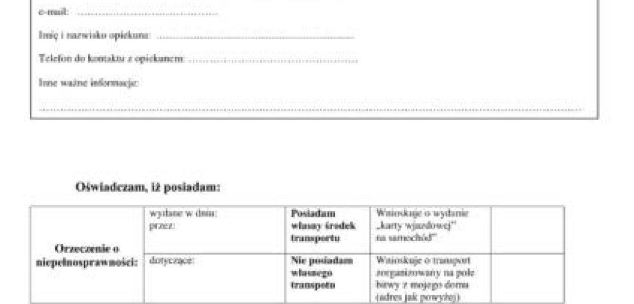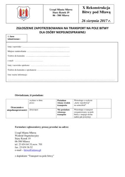 Dla osób z niepełnosprawnością ruchową oraz kombatantów przewidziane są ułatwienia w dotarciu na widownię na pole bitwy oraz przewidziana jest specjalna linia autobusowa, która dowiezie chętnych do Uniszek Zawadzkich. Osobom z niepełnosprawnością oraz kombatantom przydzielone zostanie specjalne miejsce na widowni. Wystarczy wysłać zgłoszenie.Osoby niepełnosprawne ruchowo oraz kombatanci, którzy posiadają swój środek lokomocji powinny skontaktować się z Urzędem Miasta Mława (dane kontaktowe poniżej). Otrzymają "kartę wjazdową" na samochód na pole bitwy, który będzie mógł wjechać pod samą widownię oraz otrzymają wejściówkę do zamkniętej strefy.Zgłoszenia należy kierować do Wydziału Organizacyjnego Urzędu Miasta Mława, tel. 236546433 e-mail: [email protected] na specjalnym formularzu zgłoszeniowym (wg poniższego wzoru) dostępnym w Urzędzie Miasta Mława.